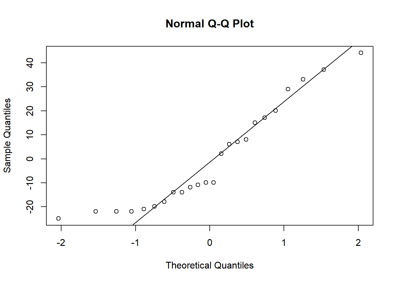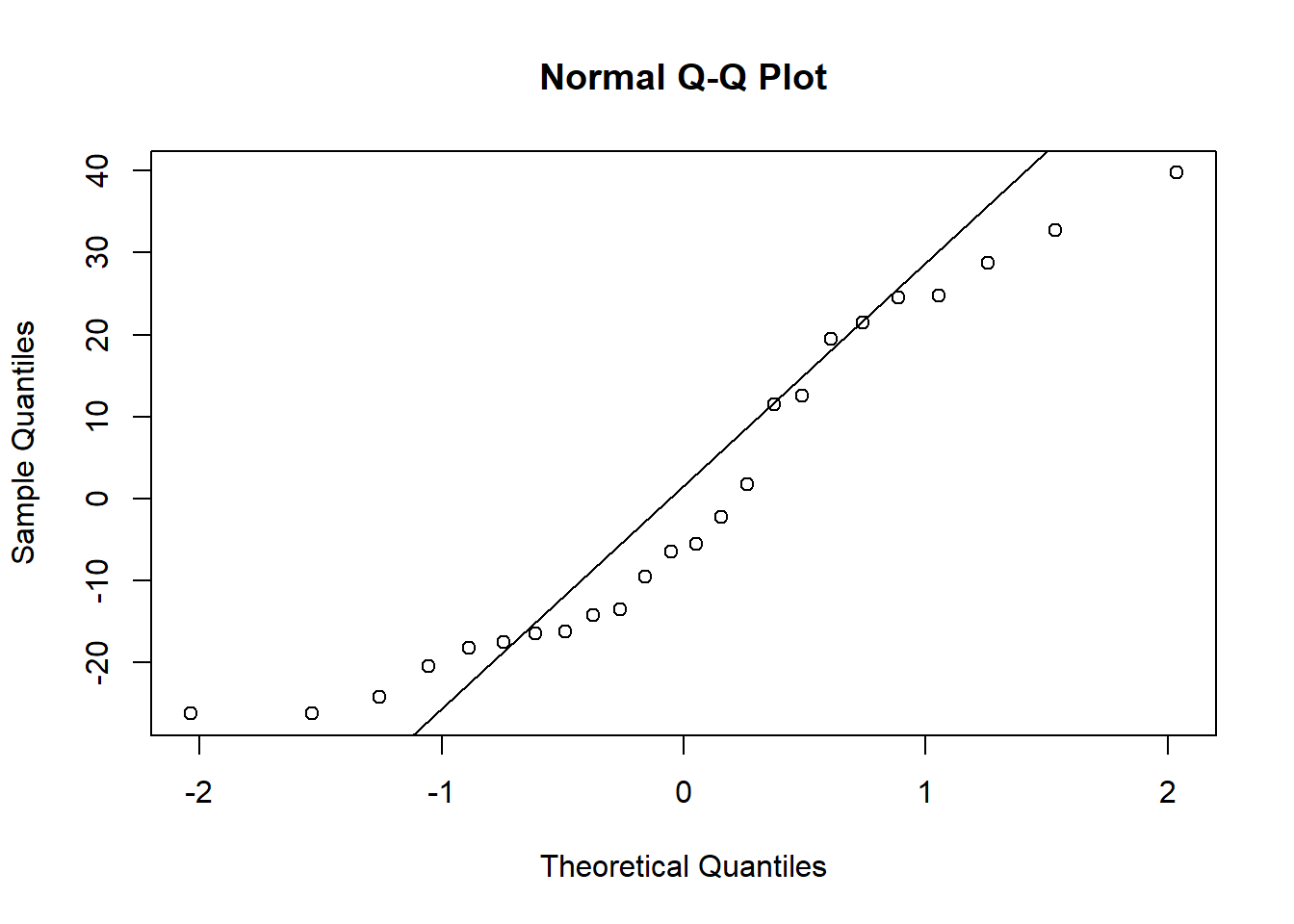 For the sake of time, we won’t check the residuals here (I can tell you that they aren’t quite normal but are also not particularly skewed), but normally that is something you should do, following the same procedure you used for the kidney example. From the scatterplot we made, you can see the the variances are roughly equal. Therefore, let’s go ahead and proceed with the test.