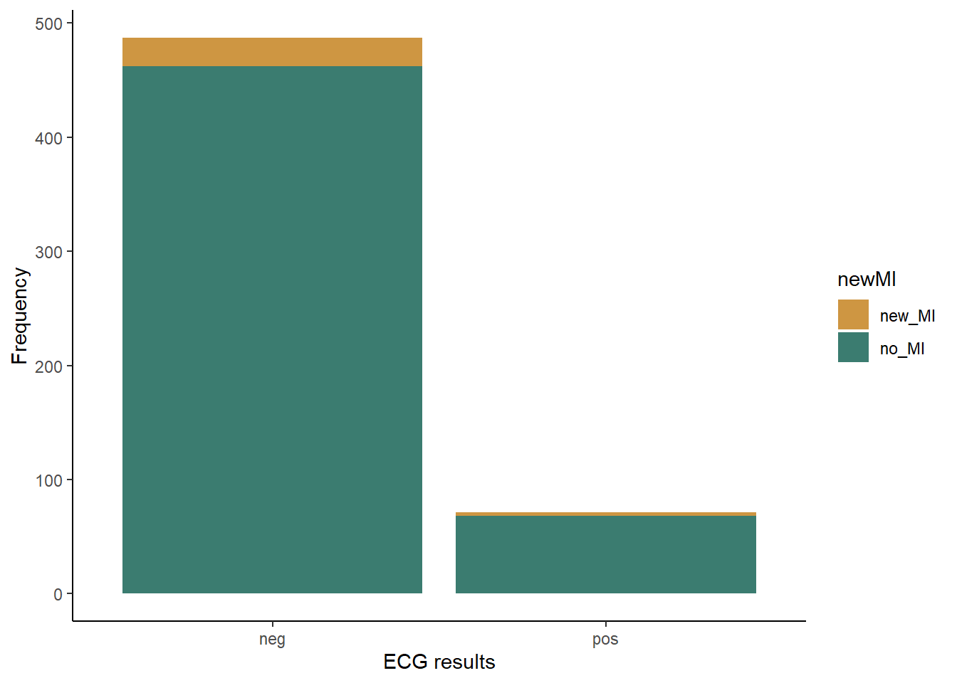 We’ll again begin by making a bar graph. This time, because we are looking at the frequencies in two different categories, we will make a stacked bar graph. We will use the ECG results as our x variable, and each bar the ECG result categories with have two colors, showing the proportion of patients in each of those categories that did or did not have a heart attack.