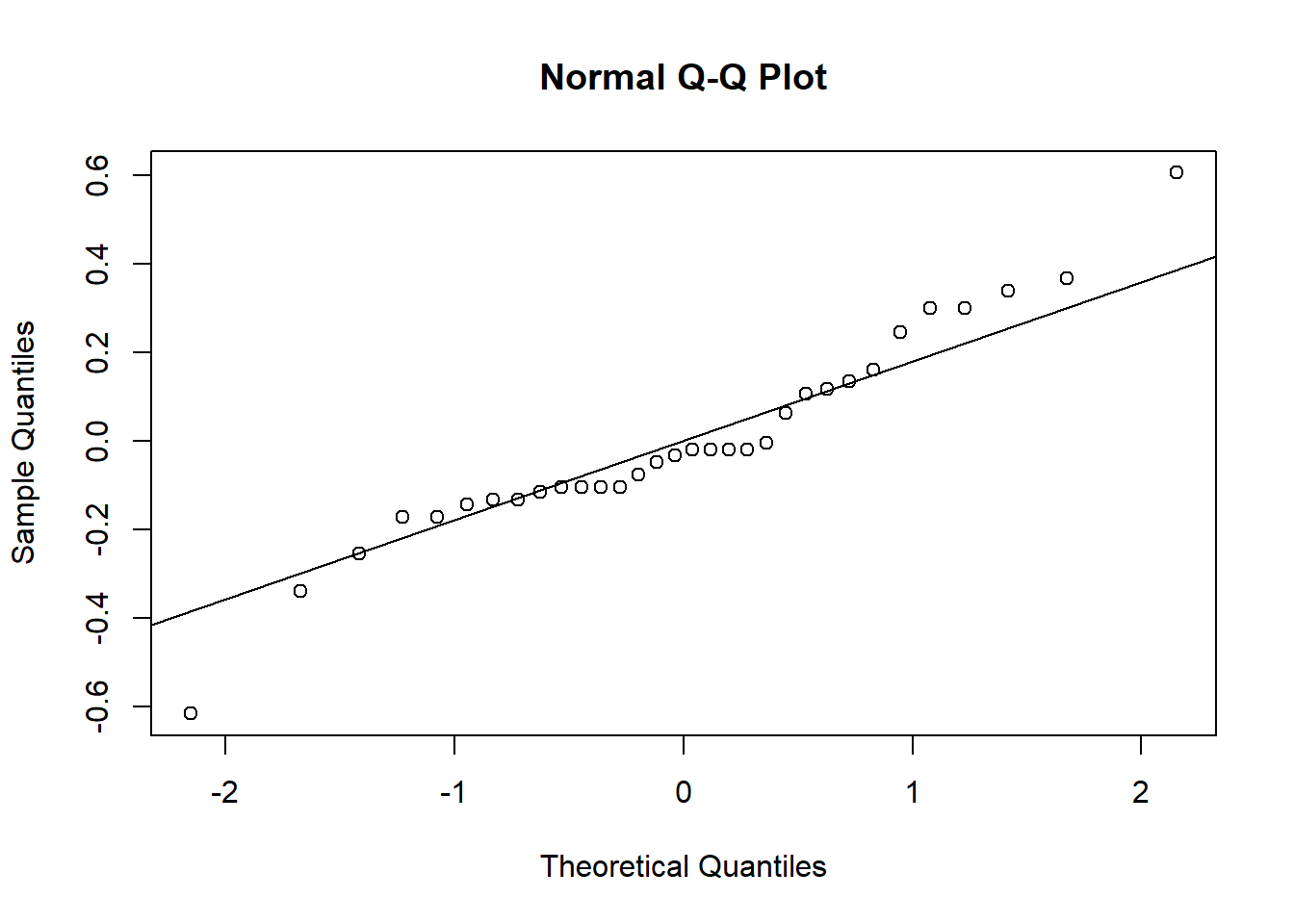 There is another type of graph that is useful for visualizing the normality of residuals, called a qqplot. This type of graph compares the residuals from a model with residuals that would be predicted based on a normal distribution. If we graph the residuals from our model against the predicted residuals, we would expect them to form a straight line if the residuals are normally distributed. If they do not form a straight line, that suggests the residuals are not normally distributed.