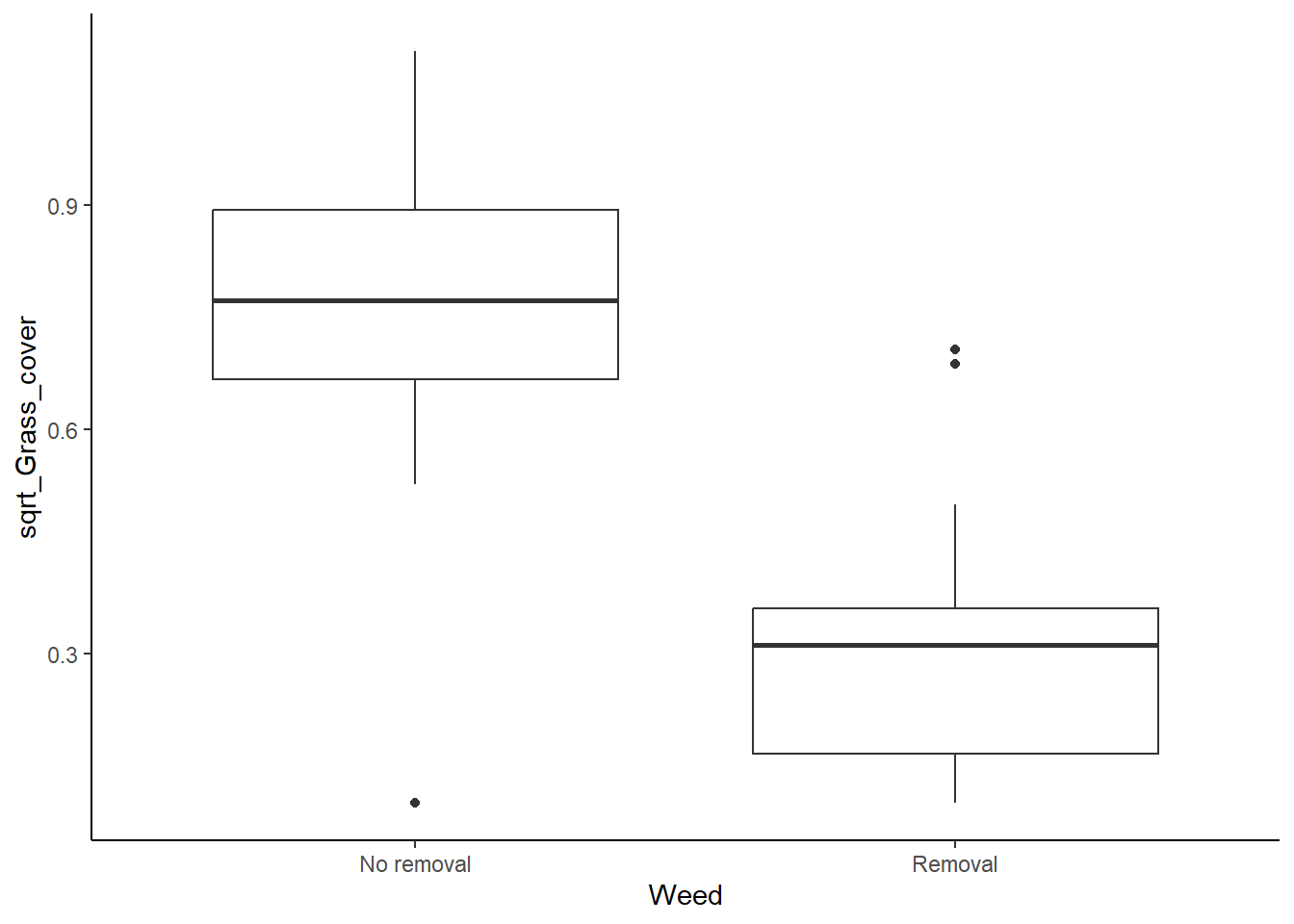 grass_ttest_sqrt <- t.test(sqrt_Grass_cover~Weed, data=grass,var.equal=TRUE)