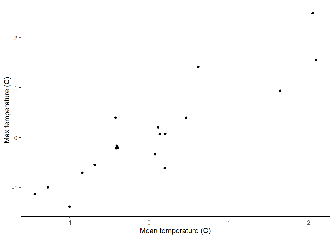 labs(x="Mean temperature (C)", y="Max temperature (C)")+