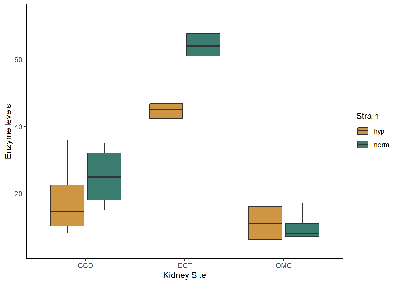 labs(x="Kidney Site", y="Enzyme levels", fill = "Strain") +