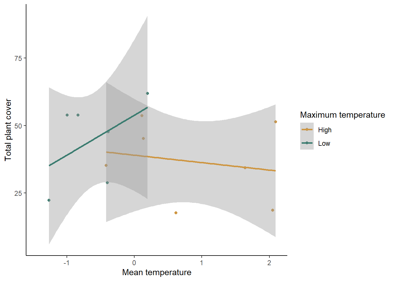 labs(x="Mean temperature", y="Total plant cover",color="Maximum temperature") +
