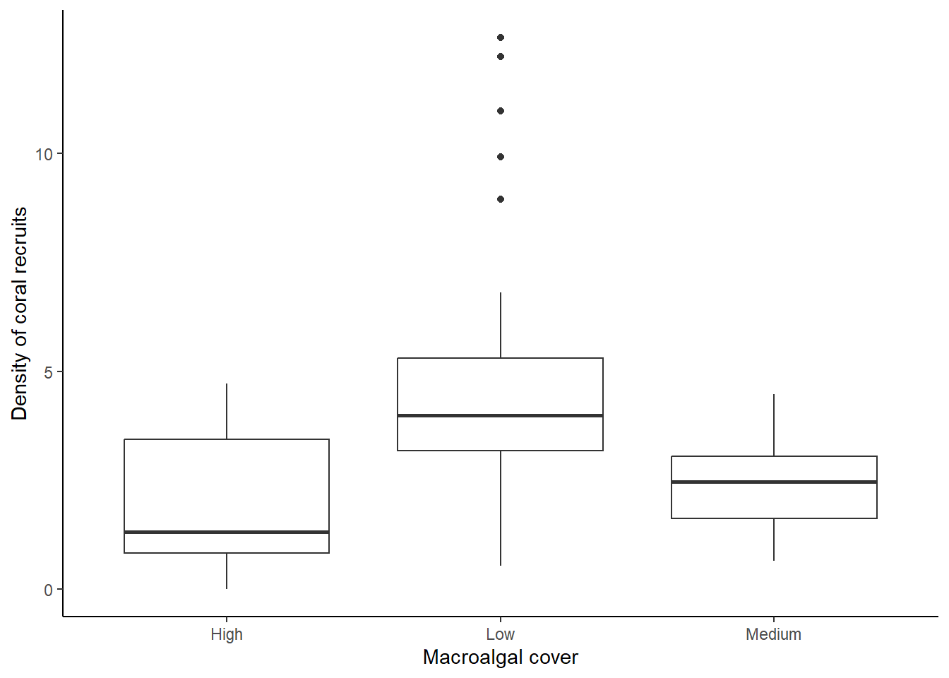 From this graph, we can see that the density of coral recruits is highest in the low macroalgal cover category. There are even some outliers in that category that have a much higher density of coral recruits than we see in the rest of the plots.