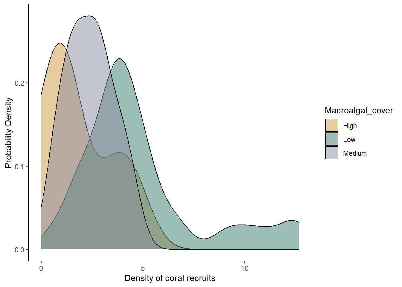 We will make a density plot for the same data we used in our boxplot: looking at the effect of macroalgae cover (low, medium, or high) on the density of coral recruits. We’ll first make the graph with some aesthetic defaults, and then we will update the code to change some of the aesthetics.