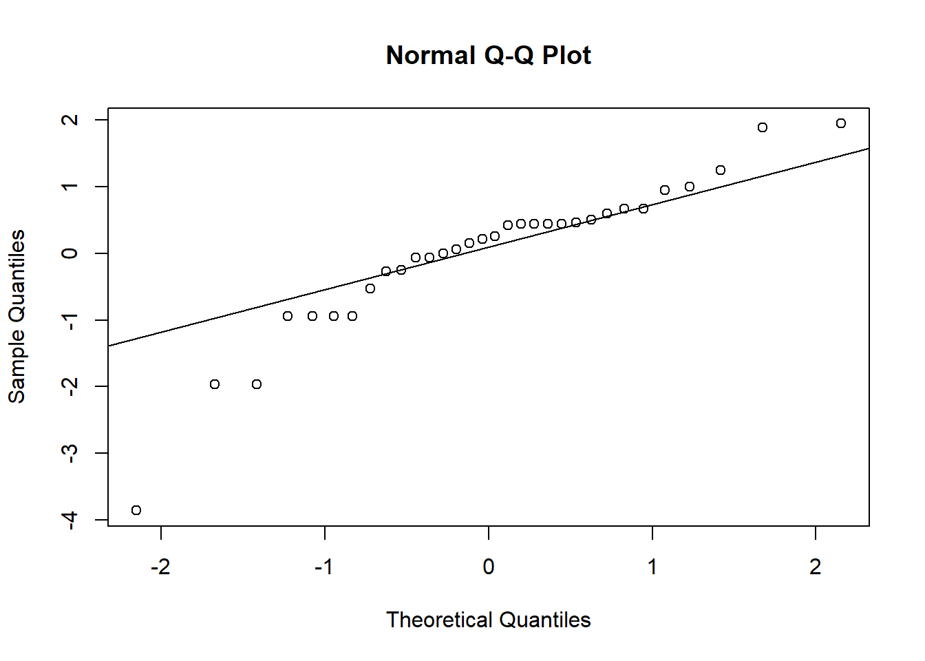 There is another type of graph that is useful for visualizing the normality of residuals, called a qqplot. This type of graph compares the residuals from a model with residuals that would be predicted based on a normal distribution. If we graph the residuals from our model against the predicted residuals, we would expect them to form a straight line if the residuals are normally distributed. If they do not form a straight line, that suggests the residuals are not normally distributed.
