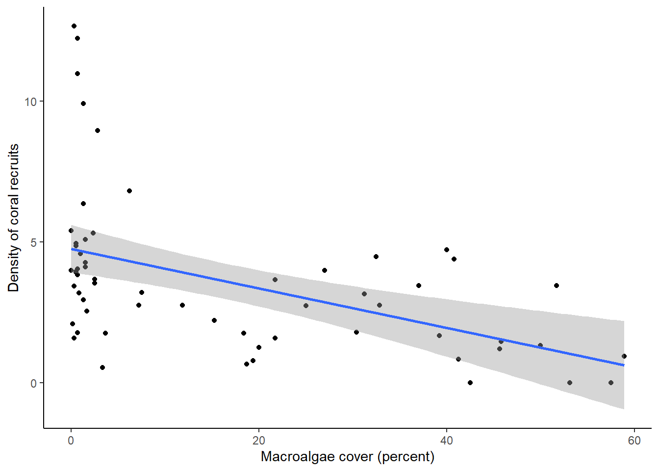labs(x = "Macroalgae cover (percent)", y = "Density of coral recruits") +